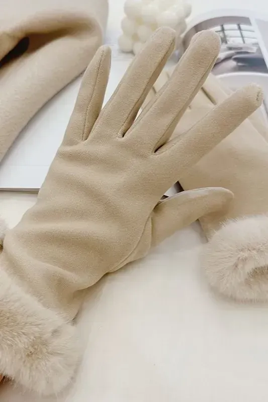 Beige Solid Faux Fur Gloves