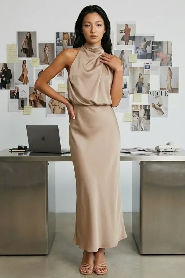 Beige Solid High Neck Maxi Dress
