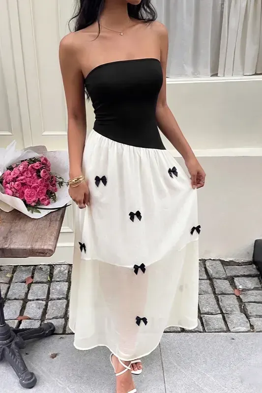 Black Bow Print Tube Maxi Dress