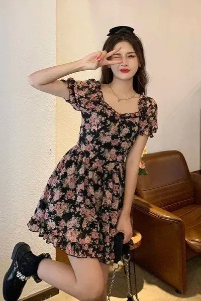Black Floral Ruffle Skater Dress