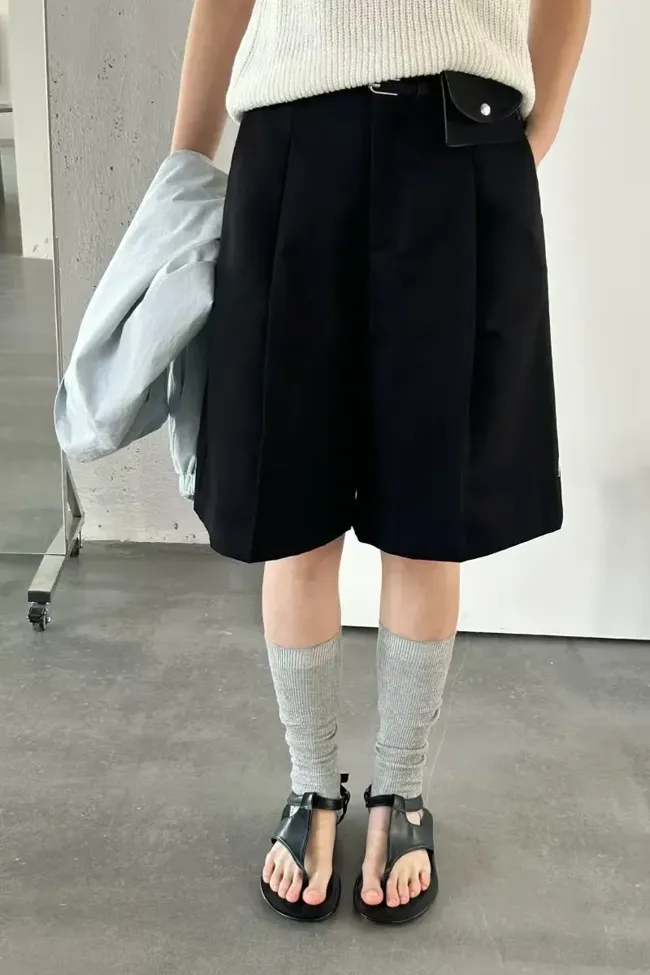 Black Pleated Mid Rise Shorts