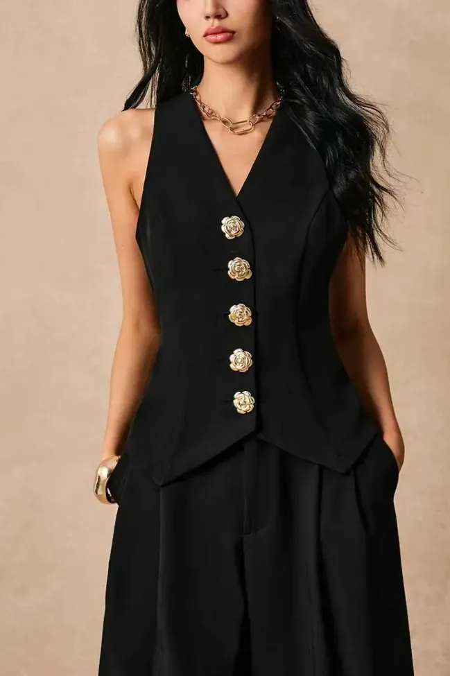 Black V-Neck Buttoned Vest Top