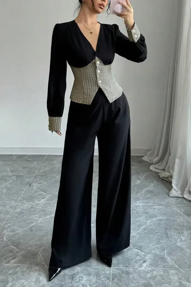 Black V-Neck Wide-Leg Co-Ord Set