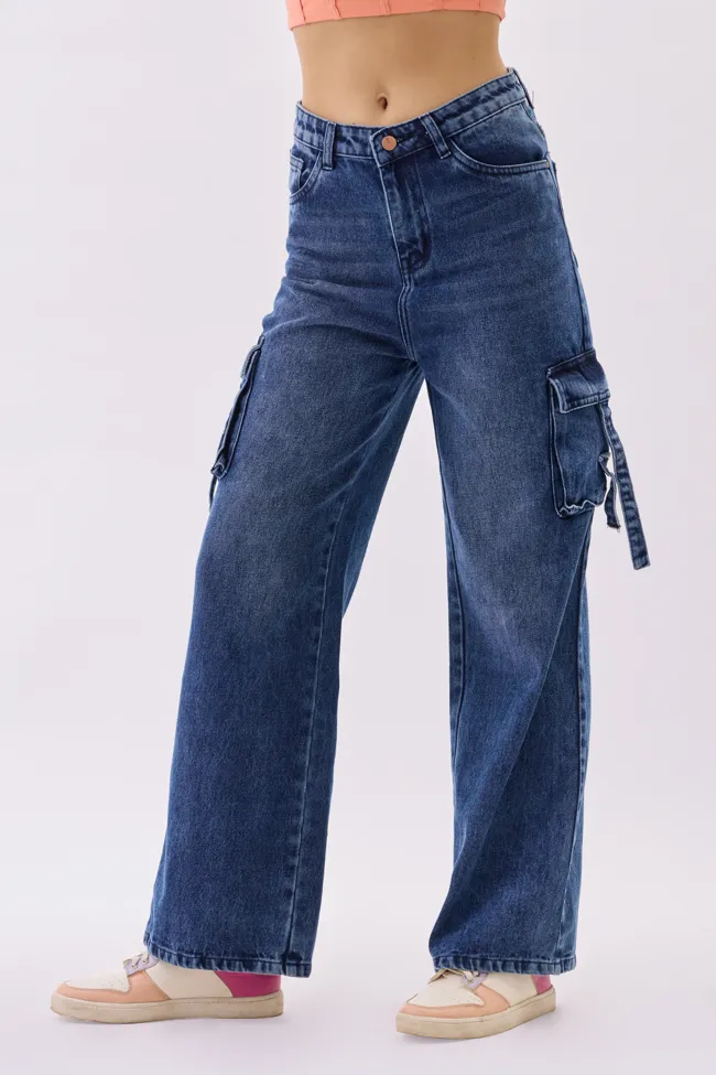 Blue Cargo Pocket Wide Leg Jeans