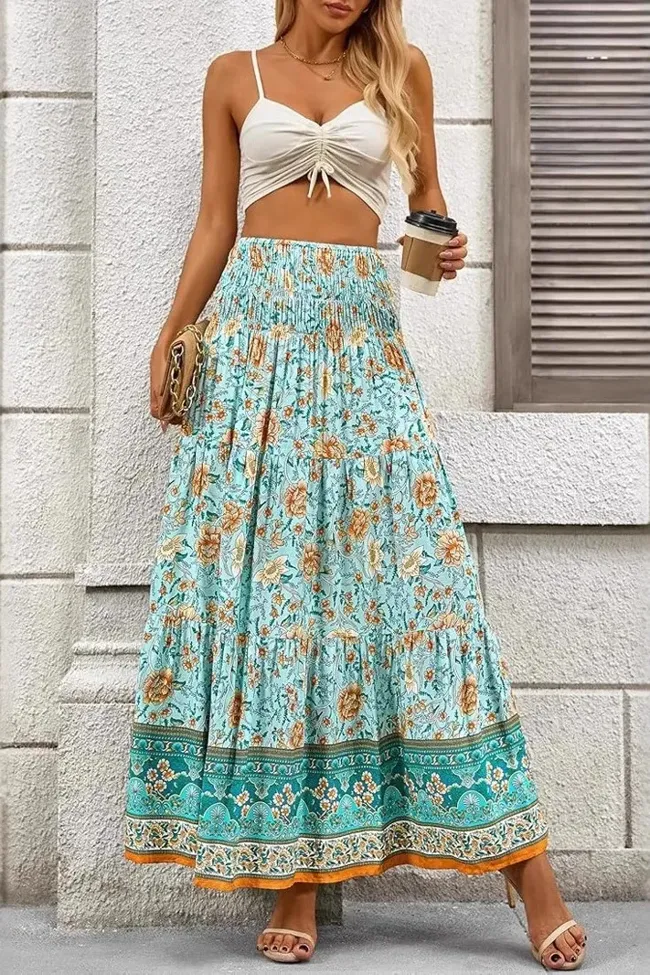 Blue Mid Rise Floral Maxi Skirt