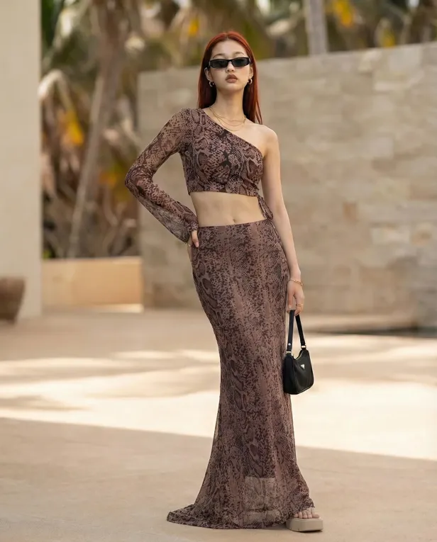 Brown Snake Printed One-Shoulder Co-Ord Set