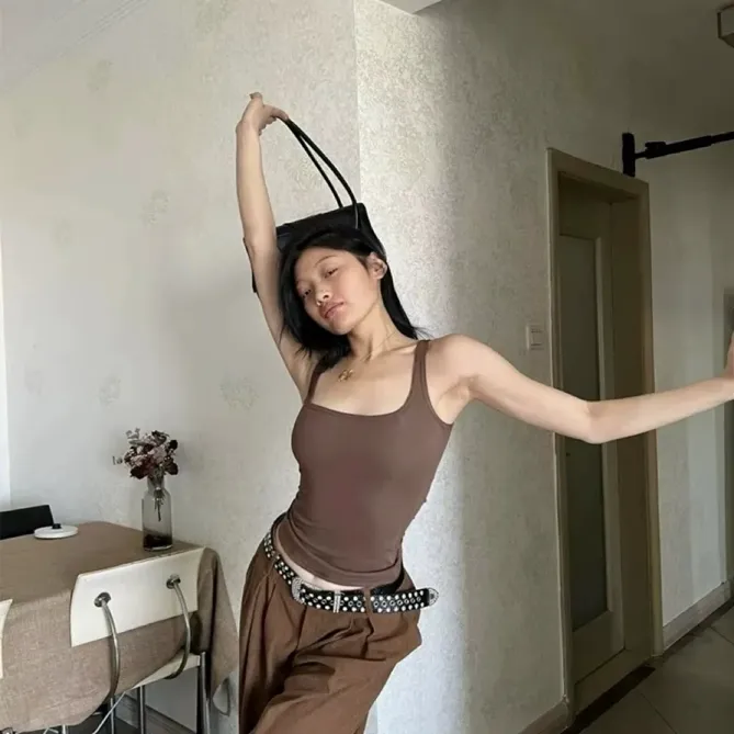 Brown Solid Square Neck Tank Top