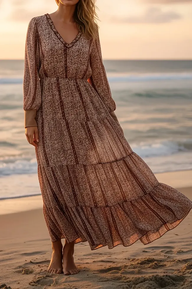 Brown V-Neck Ditsy Ruffle Maxi Dress