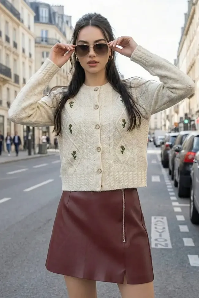 Cream Embroidered Button Down Cardigan
