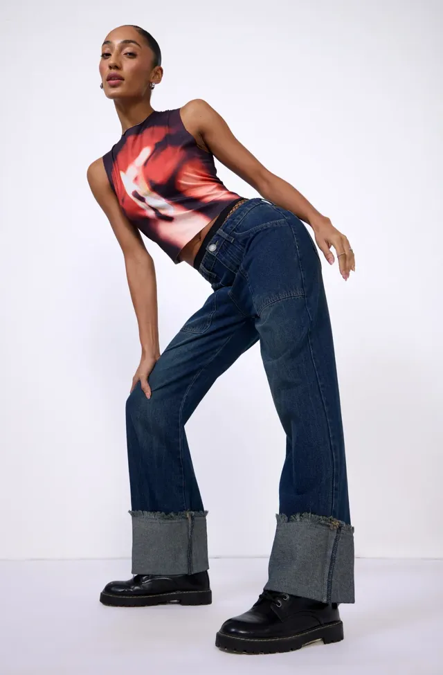 Dark Blue Folded Hem Flare Jeans