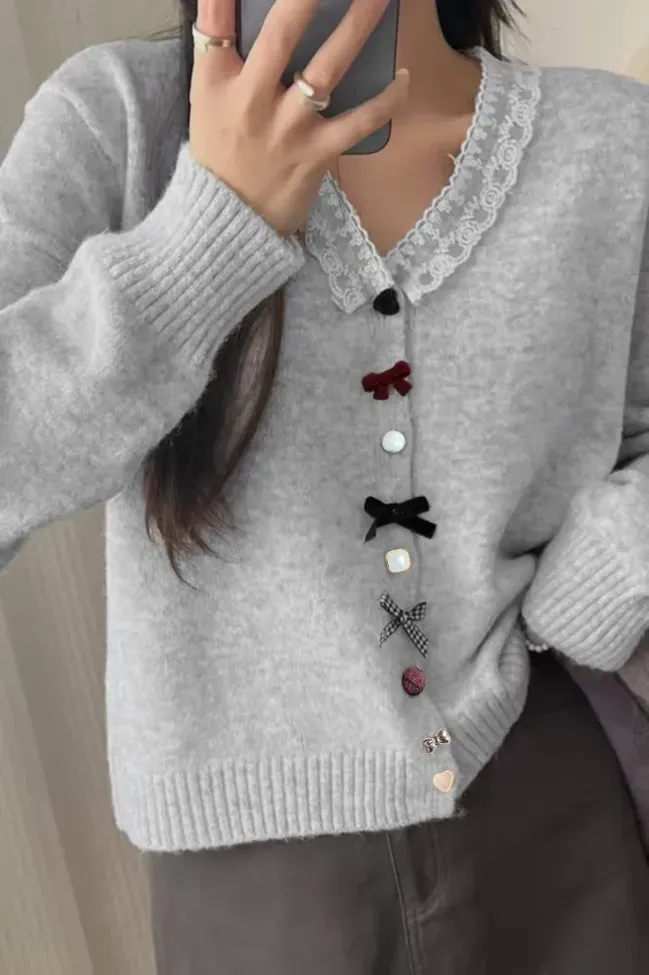 Grey Lace Insert Buttoned Cardigan
