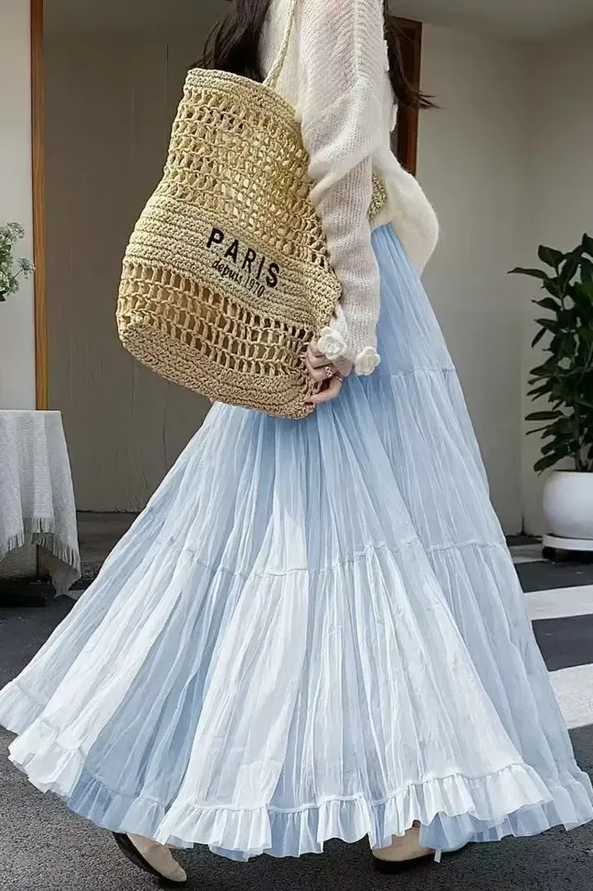 Light Blue Mid Rise Tiered Maxi Skirt