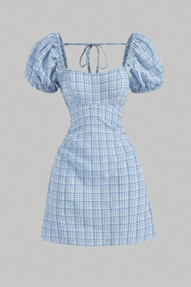 Light Blue Plaid Puff Sleeves Mini Dress