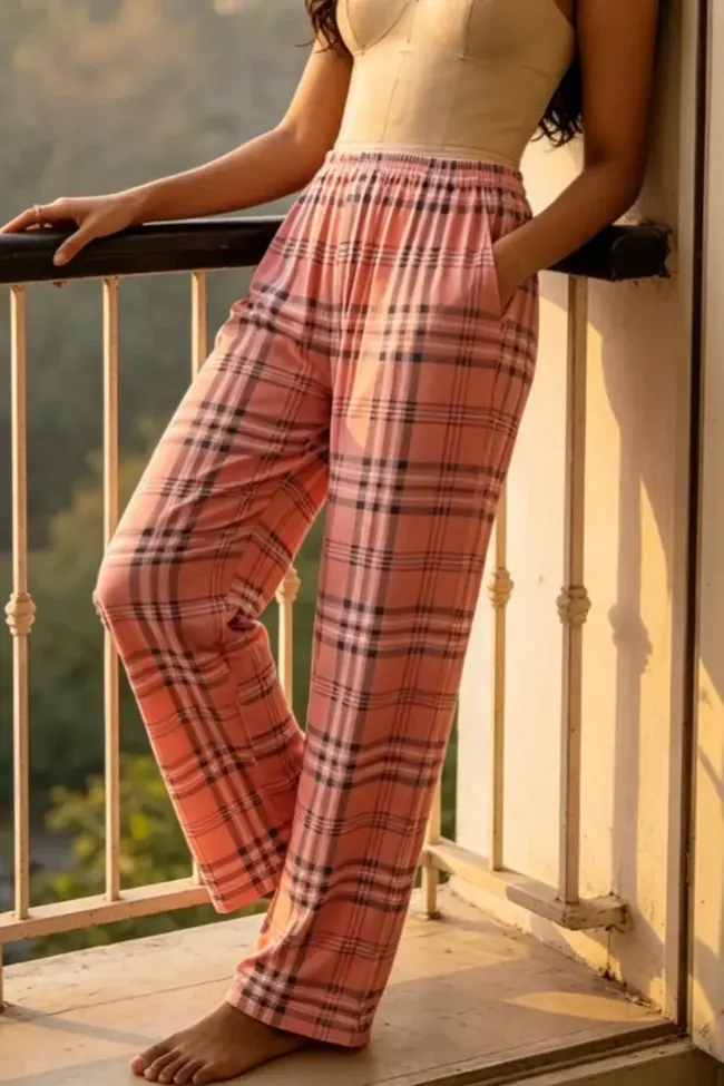 Light Pink Plaid Mid-Rise Trousers