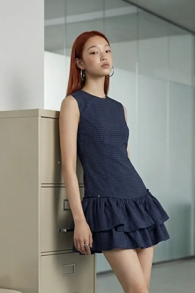 Navy Blue Check Print Mini Tiered Dress