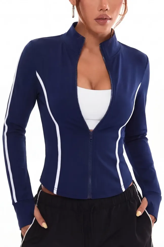 Navy Blue Striped Zipper Jacket
