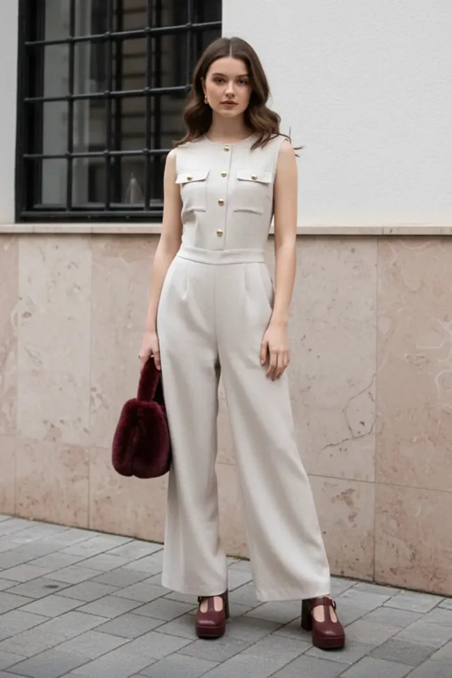 Off White Solid Buttoned Jumpsuit