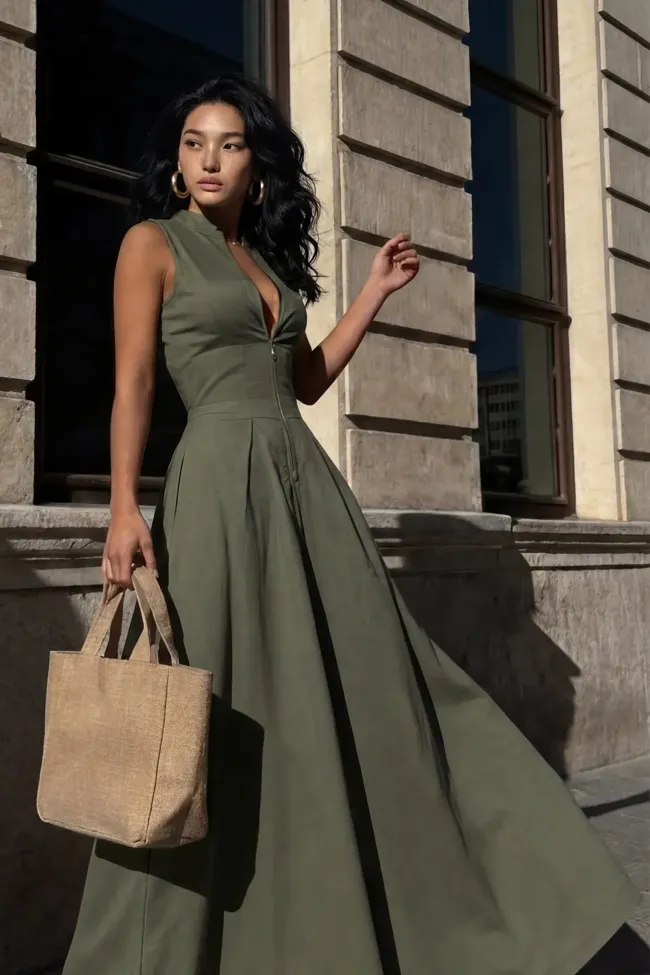 Olive Solid Mandarin Collar Midi Dress