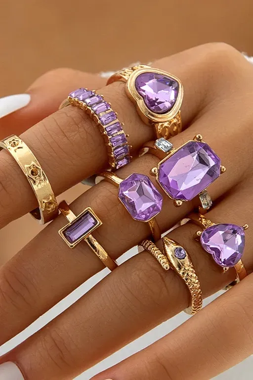 Purple Set Of 8 Statement Rings