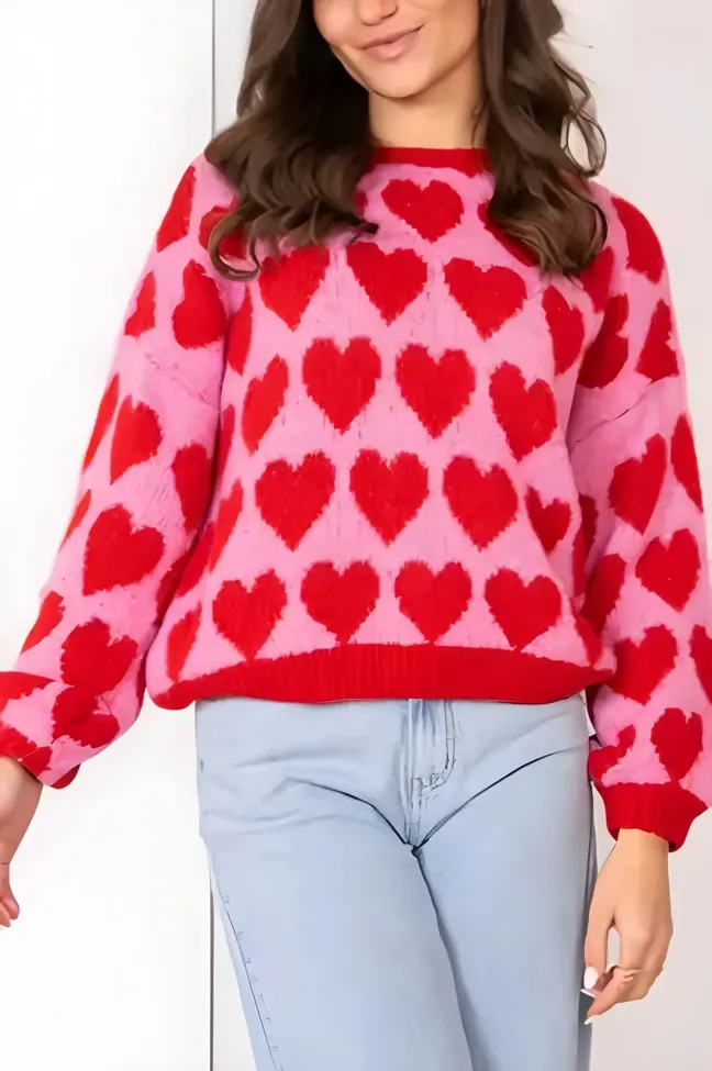 Red Heart Print Crew Neck Sweater