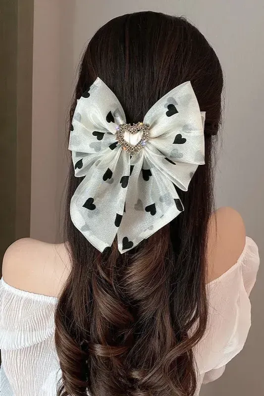White Heart Print Bow Hair Clip