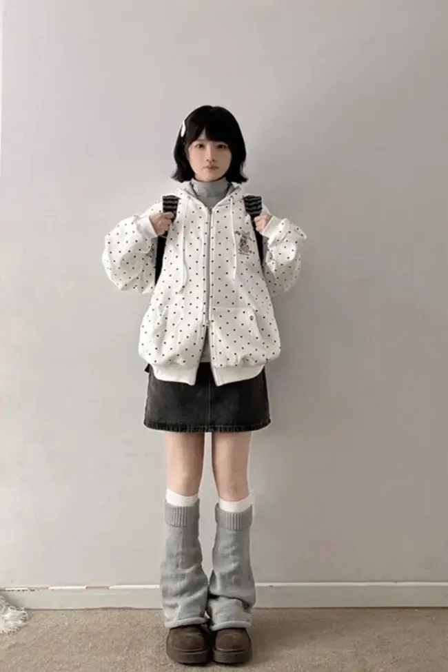 White Polka Dot Oversized Zipper Sweatshirt