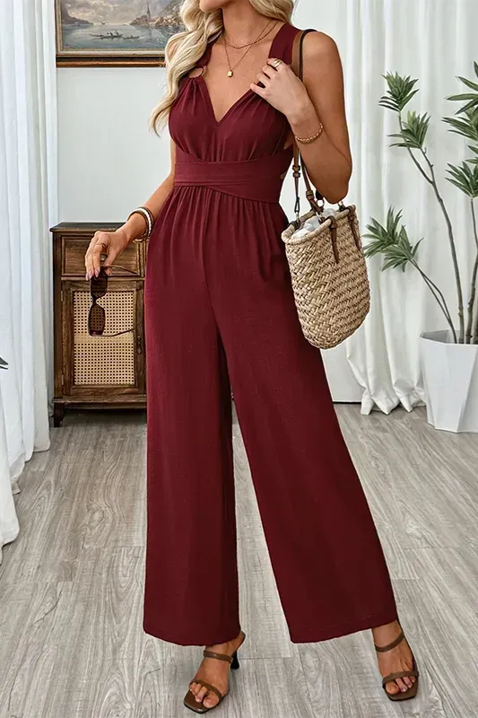 Wine Ruched V-Neck Jumpsuit