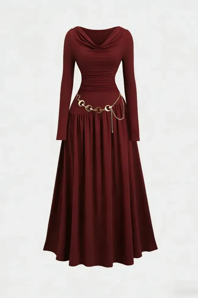 Wine Solid Cowl Neck Maxi Dress